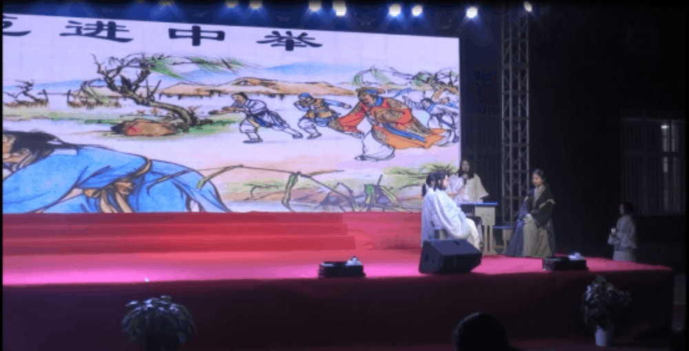 高三年級(jí)李秋蕓、魏思琪、冷依萌、李秋蕓、黃逸軒、肖愉用全新的方式演繹話劇《范進(jìn)中舉》。